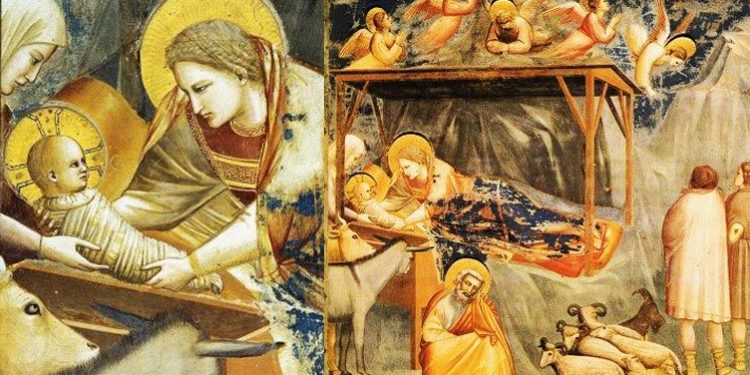 Afresku i Giotto-s në Kapelën Scrovegni konsiderohet një nga veprat më të shkëlqyera të gjenisë së artistit. Në një kasolle, Maria qëndron e shtrirë, ndërsa vendos Foshnjën në grazhd, ndihmuar nga mamia. Kau dhe gomari i kthejnë shpinën shikuesit, duke u zgjatur drejt djepit të drunjtë. Jozefi, në plan të parë, fle i mbështjellë me mantelin e tij dhe i mbështetur mbi një dorë. Engjëjt rrahin krahët në qiell. Edhe barinjtë janë kthyer nga Foshnja Hyjnore, duke i detyruar shikuesit ta sodisin skenën detyrimisht nga rreshti i dytë, sikur t’i bënin jehonë një fraze tjetër ungjillore, marrë nga shën Mateu: “Kështu të fundit do të jenë të parët, e të parët të fundit!” (20,16).