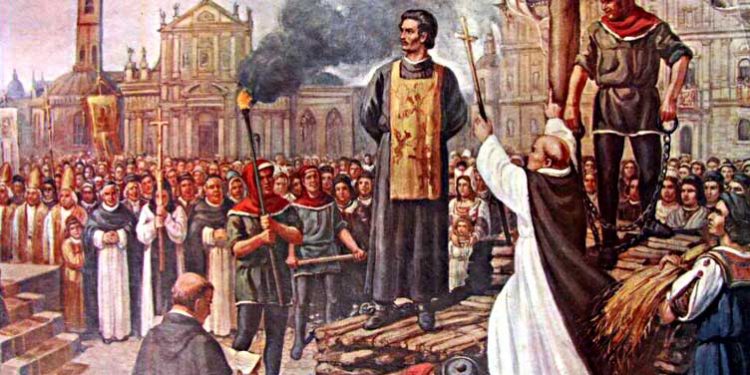 Aludime të shumta i rrethvijnë djegies në turrën e druve të Giordano Brunos, një fundi kaq të zakonshëm për Italinë mesjetës, dhe kaq mizorë për të sotmen, të një prej emrave më të njohur të kohës. Bindjet e tij shkencore janë argument më i populluar për shkaksinë që e çoi këtë iluminist në 7 vite burg dhe djegie në turrën e druve, më 17 shkurt të vitit 1600. Natyrisht ishte kohë vërshimesh të përbinshme. Kisha ende ndjehej e kërcënuar nga çdo shkas i cënimit të territoreve. Duhej me çdo kushte që masa e besimtarëve të mbahej përdhunshëm nën thundrën territ të mosdijes. Fraksione të ndryshme fetare shikonin tek Giordano Brunon, dhe tek të tjerë tejkalues të kufirit fetar kërcënimin e mosbindjes që cënonte autoritetin suprem. Çdokush që ndeshej, fundi i tij ishte i parathënë. Ekzekutimi me djegie në turra e druve asokohe për “heretikët” ishte një “spektakël” mizor, ku njerëzit pjesëmerrnin në kësi akte të përbinshme bindjeje dhe nënshtrimi të kishës, si një një shfaqje argëtuese.