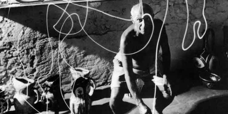 Kur Gjon Mili mbërriti për herë të parë në studion e Pikasos, ndjeu sesi drita që ishte gjithnjë bashkudhëtarja e tij u zhduk menjëherë sapo tablotë e mëdha shpërndarë kudo në hapësirën e madhe u shfaqën para tij. Ishte viti 1948 dhe fotografit shqiptar nuk i ishte dashur shumë të gjente studion e artistit në Vallauris, në Francën e Jugut, ku Pikaso ishte vendosur për të punuar. Me sy ai kërkoi çelësin e dritës dhe kur nuk e gjeti shkoi tek dritarja dhe e hapi. Një dritë e lehtë çau dalëngadalë errësirën dhe subjektet në tablotë e pikturuara sikur morën një tjetër kuptim. I veshur thjesht me pantallona të shkurtra, siç ishte duke punuar, Mili iu lut mjeshtrit të vendoste duart kryq dhe të shikonte nga aparati i tij. Një mori shkrepjesh do të ktheheshin në fotot më të mira të realizuara për Pikason gjatë gjithë jetës së tij. Në vazon me lule mbi tryezën e drunjtë, Mili këputi një lule dhe ia vendosi mjeshtrit lehtë në kokë. Njeriu që i kishte dhënë aq jetë luleve, tashmë ishte i gjithi nën fuqinë e saj. Por eksperimenti që më pas do të ndikonte dhe në pikturat e realizuara nga Pikaso ishte drita. Si fotograf novator, Mili e kishte zbuluar dritën si një element që i jepte një tjetër fuqi imazheve. Duke ia treguar Pikasos, ky i fundit do të mahnitej nga forca e saj, duke e derdhur më pas në ngjyra. Pikaso dallohej për tendencën për të shtyrë kufijtë e vetes dhe kur Mili i tregoi rrugën për të pikturuar përmes dritës, ai pranoi menjëherë. Vizatimet e dritës shfaqin Pikason duke lëvizur një dritë për të krijuar një figurë të ngjashme me kafshën që çirret në pikturën e tij, apo gruan plot forma tek “Ëndërrimtarja”. Për të krijuar efektin hipnotizues, Pikaso mbante në dorë një elektrik të vogël të cilin e lëvizte në një dhomë të errët. Për fotot u përdorën dy aparate, njëri për të kapur pamjen ballore dhe tjetri atë anësore. Duke lënë objektivin të hapur, Mili kapi vijat e dritës si vorbulla në hapësirë. Tridhjetë fotografi janë realizuar me Pikason duke vizatuar me dritë. Nga viti 1948 deri në vitin 1967, për dy dekada, Pikaso dhe Mili do të kishin një miqësi të veçantë. Askush si Mili nuk do të mund futej thellë në psikikën e artistit dhe për ta dhënë këtë psikikë përmes fotove