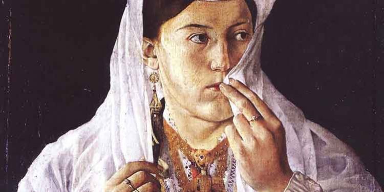 Vizitorë të panumërt, që e kanë kundruar portretin e famshëm "Motra Tone", janë intriguar nga shprehja që personazhi ka në portret. Në galerinë Kombëtare të arteve thonë se shumë prej vizitorëve pyesnin: Përse Tonia e ka hedhur në njërën anë vështrimin e saj të druajtur? Studiuesit e lidhin me një premtim që ajo i kishte bërë të shoqit Andrea Shkanjeti. Tonia duke pritur një "qortim" të të shoqit për këtë pozim, që po bënte me veshjen popullore, vështrimin e kishte drejtuar nga dera. Në këtë pozim dhe në këtë moment psikologjik piktori e gjeti me vend ta përjetësojë duke gjykuar si artist se vepra do t'i dilte e një niveli të lartë artistik. Në këtë vepër, napa e bardhë, që ka rrethuar fytyrën e saj në sfondin e errët të pikturës e përcakton qartë figurën e gruas.