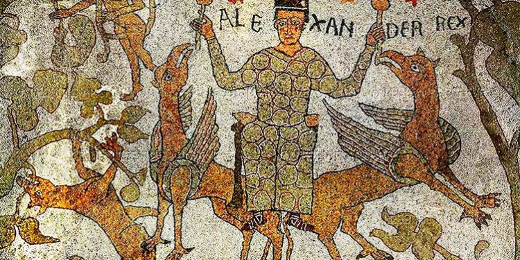 Mozaiku i famshëm në katedralen e Otrantos e përshkruan Aleksandrin e Madh, me veshje persiane si REX/Mbret të Botës, duke fluturuar me dy Grifonë me krahë.