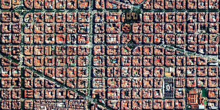 Qarku Eixample në Barcelonë, Spanjë, karakterizohet nga modeli i saj i rreptë i rrjetit dhe apartamenteve me oborre komunale. Ky dizajn i përsosur dhe vizionar ishte puna e planifikuesit urban, Ildefons Cerdà, (23 dhjetor 1815 – 21 gusht, 1876). Plani i tij përmban rrugë të gjera që zgjerohet në kryqëzimet tetëkëndore për të krijuar një shikueshmëri më të madhe me rrezet e diellit në rritje, ventilim më të mirë dhe më shumë hapësirë për parkim afatshkurtër.