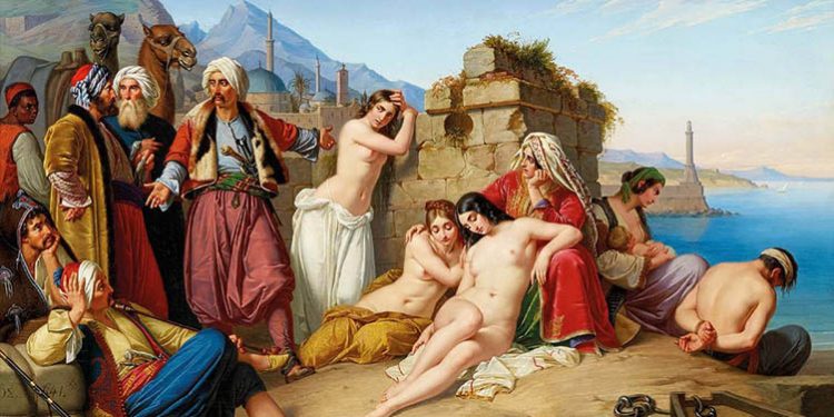 “Një treg skllevërish” është një pikturë e realizuar në vitin 1839 nga mjeshtri gjerman, Paul Emil Jacobs (20 gusht 1802 në Gotha – 6 janar 1866). I njohur si një aplikues i tematikave orientale, kryesisht atyre nudo, por dhe portreteve të shumta ku spikat si një element shumë domethënës veshja, si tradicion dhe përcaktueshmëri e nacionalitetit dhe tërësisë së pasurisë shpirtërore të bartësve të këtij visari. Paul Emil Jacobs është i shumënjohur dhe shumëkonsideruar nëpërmjet tablove të bujshme të galerisë së tij, njëra prej të cilave, “Kira Vasiliqi me Ali Pash Tepelenën” në një moment intimiteti, një pikturë e cila shpreh gjithë peshën specifike të dukshmërisë dhe afrisë perceptuese të burrërores tek Ali Pash Tepelena dhe feminilitetin tek Kira Vasiqliqi.