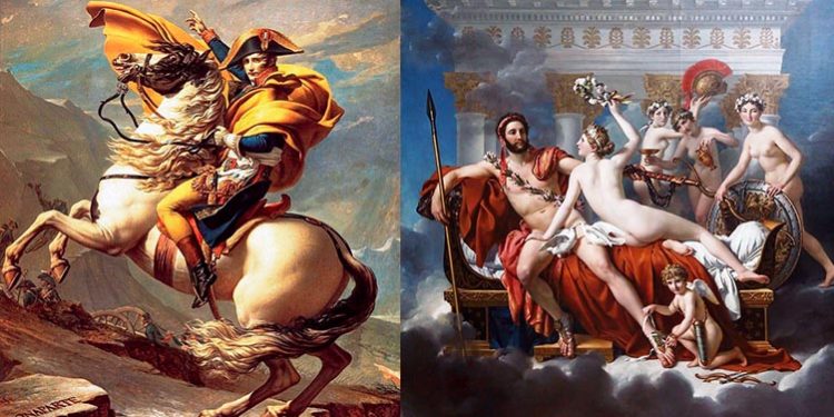 Jacques-Louis David. Homeri, antikiteti grek, mitologjia nuk do të kishte kuptim pa Ruben, por me Louis David, mitologjia dhe eposi formësohen duke marrë trajtë. Kapërcyelli i ngjarjeve në Francën e stuhishme gjen gjithashtu te Louis David vetë rrëfyesin.