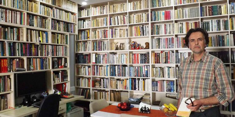 Ajo është e përbërë nga… libra, libra, libra, blloqe, shënime. Është e dalë nga pema dhe frymëmerr si një pyll nën rënkimin e sëpatave dhe shtërzimin e shndërrimeve; blatimit në letër dhe frymë, në shpirt dhe përfytyrime; në dhimbje dhe prushëti yjesh. Sa e sa net e jetë kredhur e mbrujtur në pafundësi, janë derdhur në plumb e aromën e luleve, që dalldisja i ka përjetësuar në fjalë, sa e sa përjetësi ka ç’varrosur përfytyrimi dhe jetësuar pasioni, sa e sa kohëra janë derdhur prej qiejve në sytë e përshkënditur në diej e pena ngjyer në gjak e rrufe. Sa? Sa ka frymuar, e do të mbretërojë e bukura e shpirtit dhe e hyjshmja e besimit mbi faqe të dheut. Sa të ketë prehje e epje për çdo ngulm e vrull të njeriut për të pasuruar me ndjenjë e përjetim çdo rrahje të zemërës së tokës në këtë udhëtim të gjëmimshëm të galaksisë drejt të gjithmonshmes.