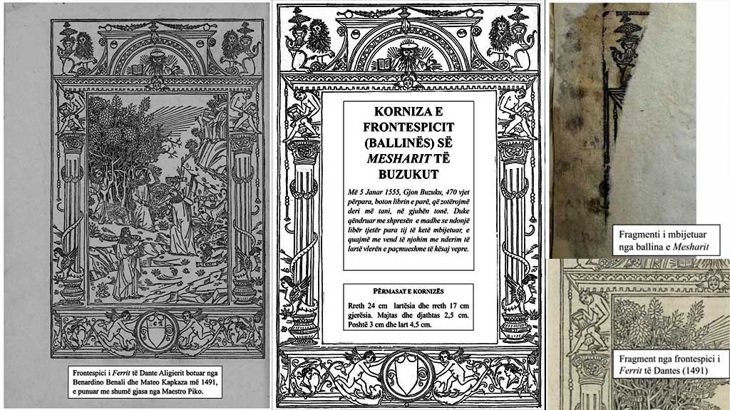 Frontespici i Mesharit të Gjon Buzukut mbetet një nga ato gjurmë të rralla ku historia e librit, arti i shtypshkrimit venedikase dhe identiteti i një gjuhe që po kërkonte vendin e saj në botën e kulturës prekin njëri-tjetrin me një finesë pothuaj hyjnore. Korniza e dëmtuar e ballinës, e ruajtur në fletën 96 të kopjes vatikanase, ngjan sot si një ftesë për të hyrë në laboratorin ku lindi libri i parë i shqipes një portë që nuk na e zbulon më brendinë, por na lë të sodisim disi mistershëm bukurinë e saj të amputuar nga koha.